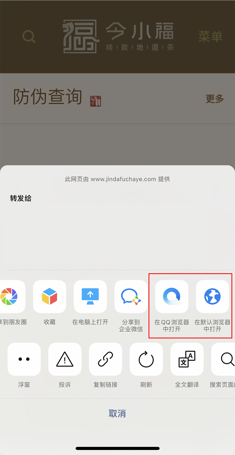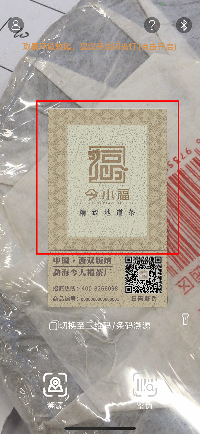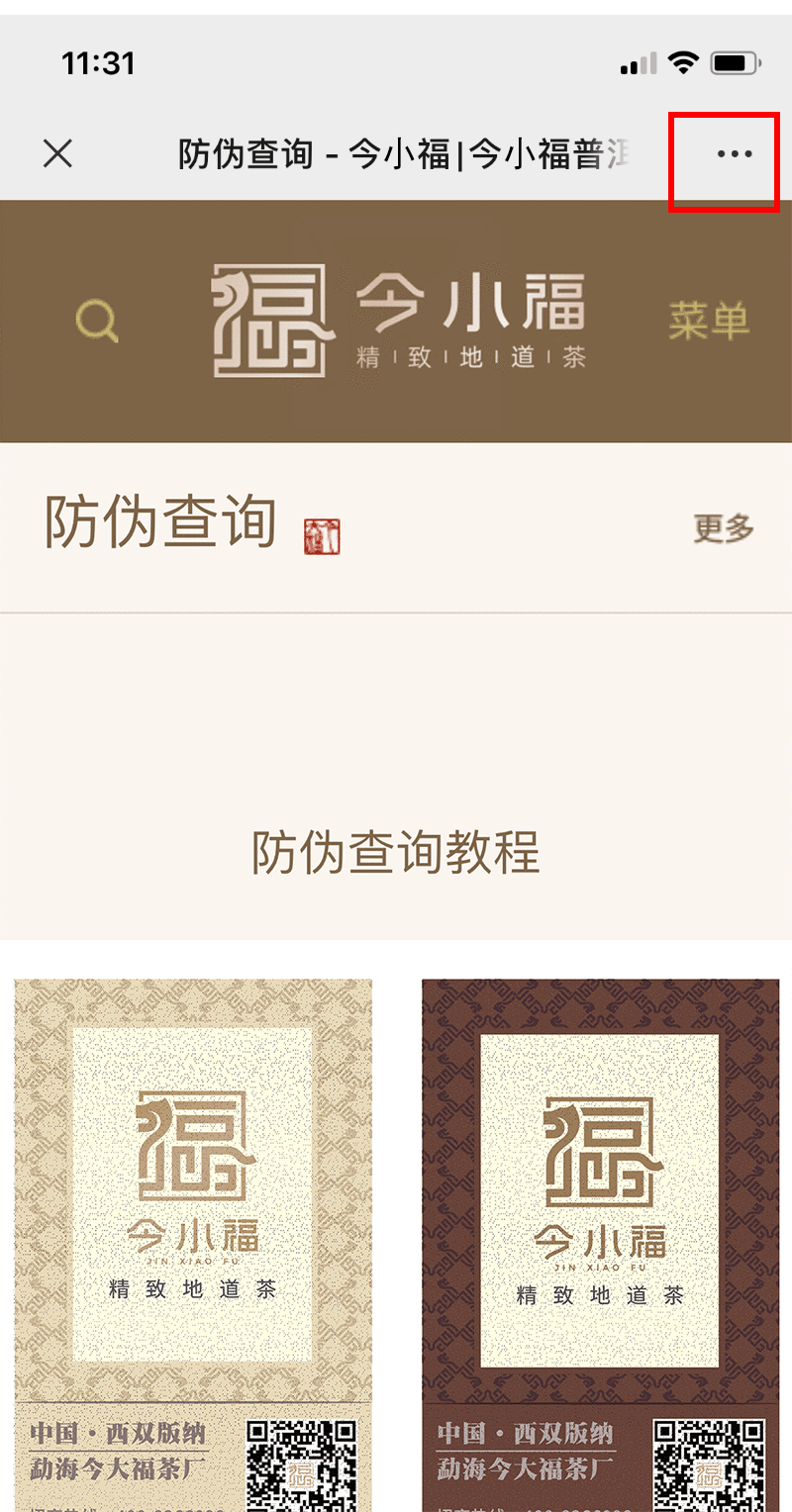 | 1、当您拿到今小福茶业产品时,请您先查看产品包装是否完整无破损。确认完整无破损后,请打开手机微信扫一扫,(如下图所示)扫描防伪标签上的二维码到达本页面。 |